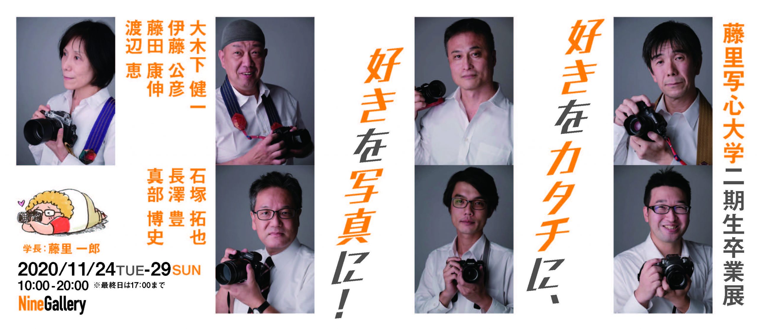 2020 11月 【11/24-29】藤里写心大学第二期生卒業展『好きをカタチに、好きを写真に!』【開催概要】▼タイトル: 藤里写心大学二期生卒業展 「好きをカタチに、好きを写真に!」 ▼日程:2020年11月24日(火)~11月29日(日) ▼時間: 10:00~20:00※最終日29日は17:00まで ▼入場:無料 ▼出展者:大木下 健一 石塚 拓也 伊藤 公彦 長澤 豊 藤田 康伸 真部 博史 渡辺 恵 ▼学長:藤里 一郎 Post Share EVENT一覧