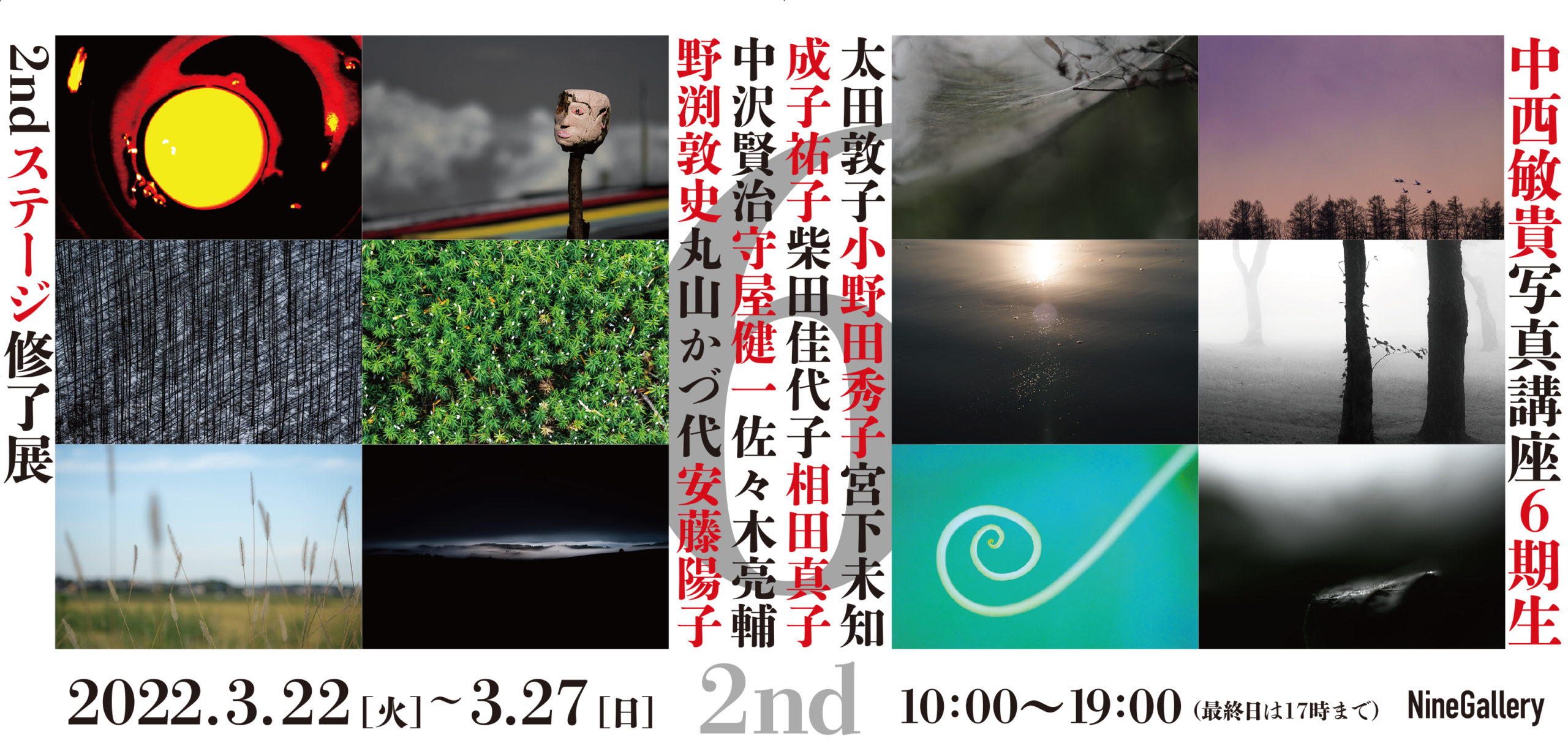 2022 3月 【3/22-27】中西敏貴写真講座6期生2ndステージ修了展【展覧会概要】 ▼タイトル:中西敏貴写真講座6期生2ndステージ修了展 ▼会期:2022年3月22日(火)―3月27日(日) ▼時間:10:00-19:00(最終日17:00閉場) ▼入場料:無料▼イベント:未定▼参加者:太田敦子/小野田秀子/宮下未知/成子祐子/柴田佳代子/相田真子/中沢賢治/守屋健一/佐々木亮輔/野渕敦司/丸山かづ代/安藤陽子 Post Share EVENT一覧