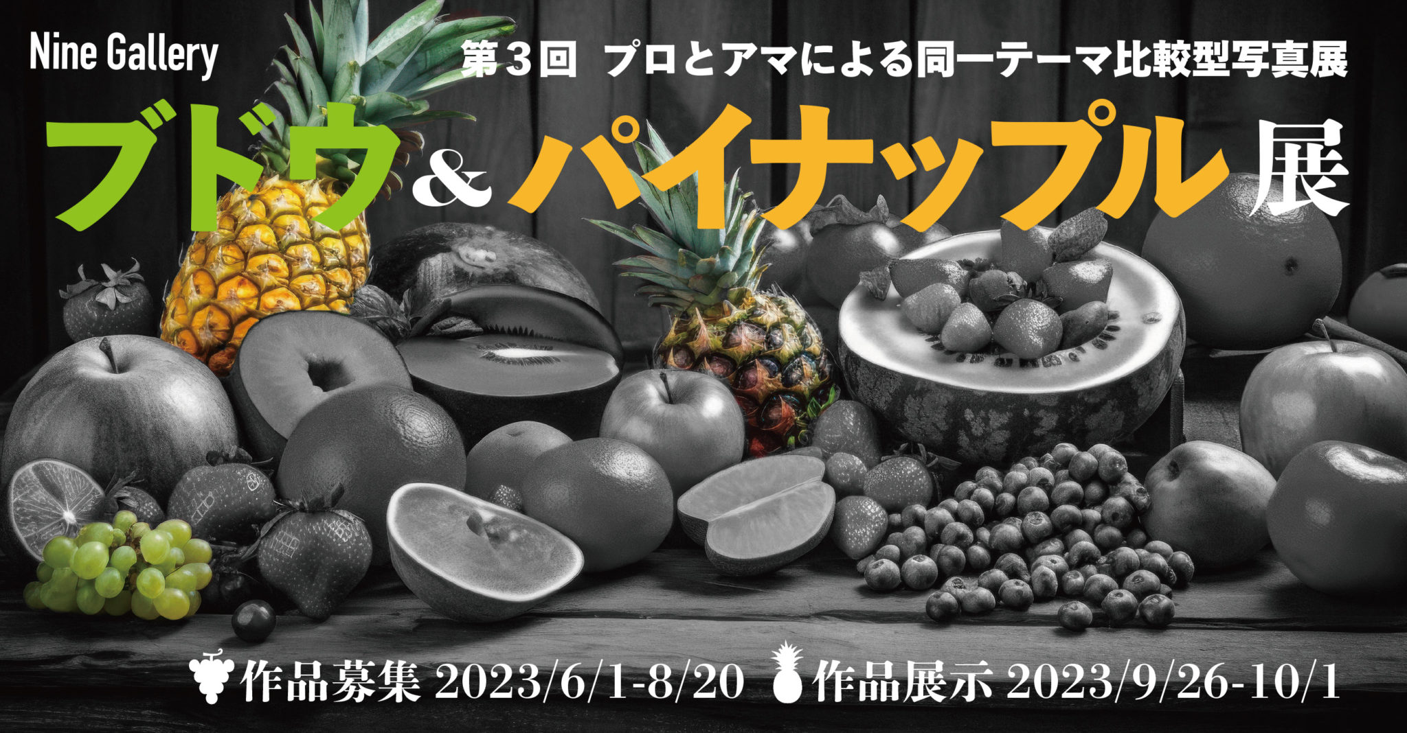 2023年秋、9/26-10/1にnine galleryで「ブドウ&パイナップル」展を開催します。そこで、ブドウかパイナップル、どちらかを【主役】で撮った作品データ1点を公募します。作品募集は6/1-8/20まで。応募は無料となりますのでどしどし送信をよろしくお願いします。なお、ファイナリスト13名はギャラリーでの展示となりますが、こちらは昨今の材料費高騰に伴い今回から出展料として3000円を頂戴いたしますので、お間違いのありませんようによろしくお願いいたします。