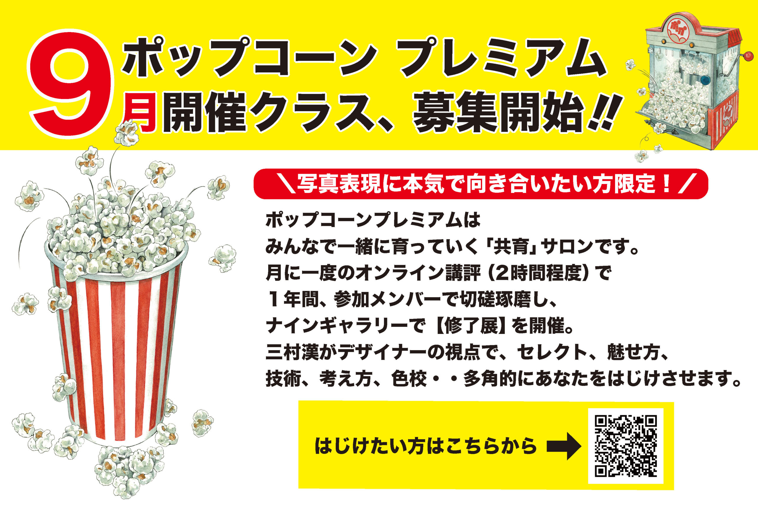 WORKSHOP ポップコーンプレミアム9月開催クラス、募集開始! 2024.07.09 WORKSHOP 一年後の修了展に向けて、切磋琢磨するオンラインワークショップ。9月からの参加者募集開始です!詳細・お申し込みは下記よりご確認ください。詳細・申し込み Post Share 《写真撮影の旅》9月20-22開催!写真家・小澤太一講師による【モーレツ北海道3日間】前の記事 【8/9(金)】戸塚学写真展『SOAR HIGH』ギャラリートーク次の記事 新着のお知らせ 1/25(土)野町和嘉×三村漢 ギャラリートーク開催決定! 2024.12.18 1/7(火)・1/10(金)渋谷敦志写真展ギャラリートーク 2024.12.01 【当日立ち見歓迎!】11/22(金)小林民子氏 ギャラリートーク開催 2024.11.22